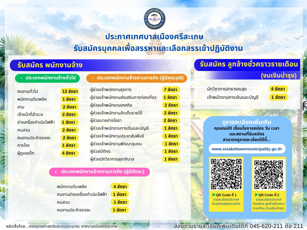 ประกาศเทศบาลเมืองศรีสะเกษรับสมัครบุคคลเพื่อสรรหาและเลือกสรรเข้าปฏิบัติงาน รับสมัคร พนักงานจ้าง ประเภทพนักงานจ้างทั่วไป จำนวน 9 ตำแหน่ง 28 อัตรา ประเภทพนักงานจ้างตามภารกิจ (ผู้มีทักษะ) จำนวน 4 ตำแหน่ง 7 อัตรา ประเภทพนักงานจ้างตามภารกิจ (ผู้มีคุณวุฒิ) จำนวน 10 ตำแหน่ง 19 อัตรารับสมัคร ลูกจ้างชั่วคราวรายเดือน (งบเงินบำรุง)นักวิชาการสาธารณสุข 4 อัตราเจ้าพนักงานการเงินและบัญชี 1 อัตรา ดูรายละเอียดเพิ่มเติมคุณสมบัติ เงื่อนไขการสมัคร วัน เวลา และสถานที่รับสมัครสามารถดูรายละเอียดได้ที่ QR Code ที่ 1 : ร …